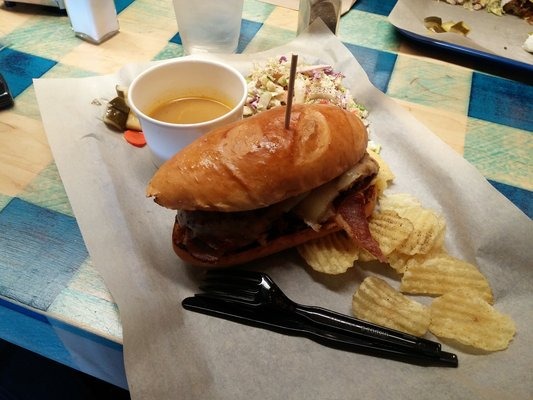 The Juban starts with a toasted sub roll, which is layered with yellow mustard and pickles on the bottom half. Atop that goes hot maple-smoked Canadian ham and house-steamed pastrami from a smokehouse in the Bronx, and then it's topped with Swiss cheese. After a run through the panini press, the cheese is melty, the bread is crispy, and the sandwich is just about perfect (especially with a New York half-sour pickle on the side). Who needs roast pork when you've got pastrami?