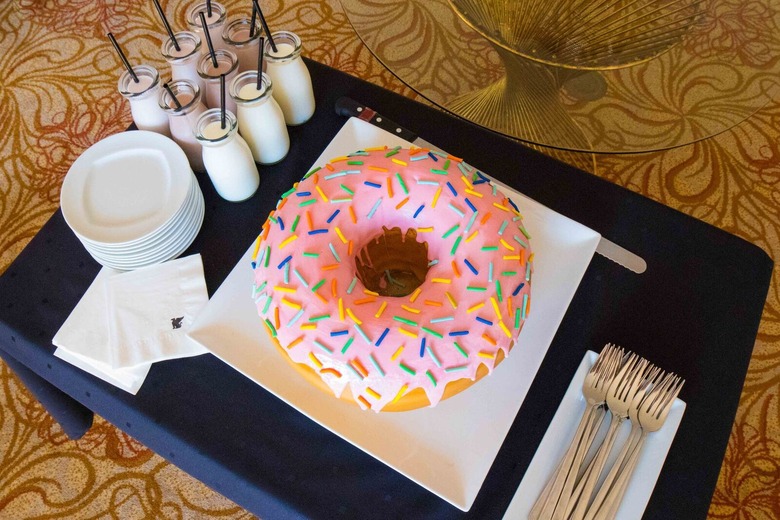The sprawling Palm Desert property is offering a massive 10-pound doughnut, wheeled to your guestroom door along with nine milkshakes to wash it down. The doughnut is made of layered Tahitian vanilla cake, cream, and raspberry jelly, topped with layers of fondant, pink crème frosting, tropical fruit macaron crisps, and the biggest neon sprinkles you've ever seen. It's a beast, measuring three feet wide and one foot tall. Holy diabetes, Batman.