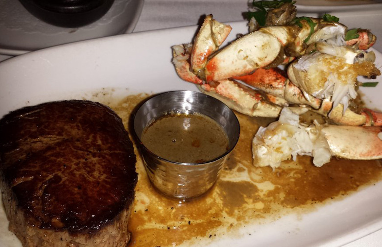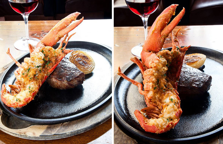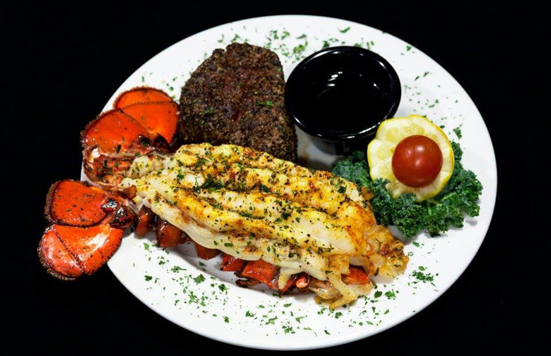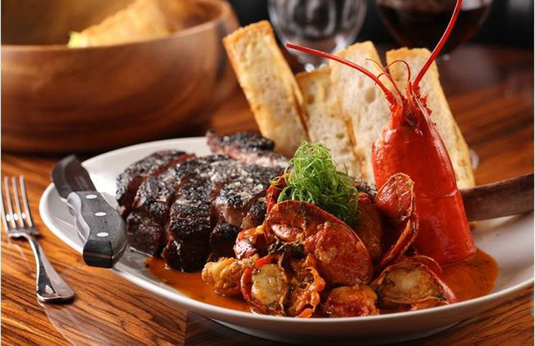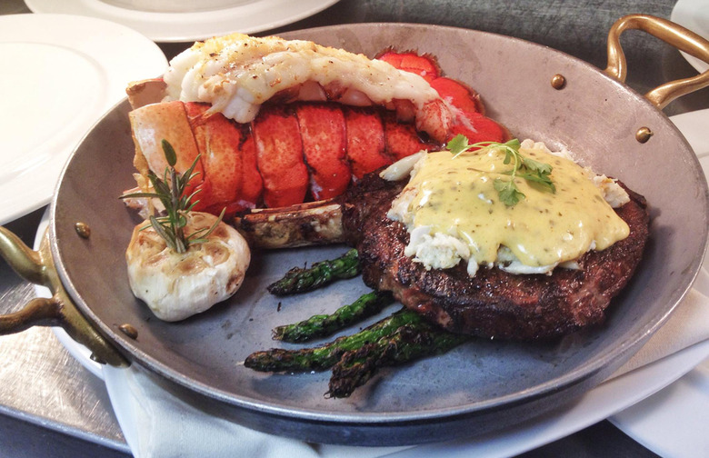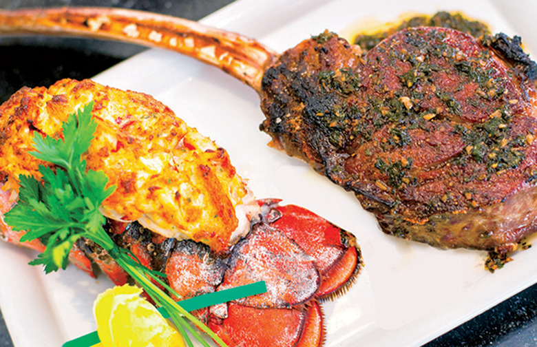 Browse the menu at this super-popular Miami steakhouse (which also has a Cleveland location) and you won't see any surf and turf, but chef Peter Vauthy has an off-menu item waiting in the wings that will knock your socks off. It starts with a 28-day dry-aged prime tomahawk ribeye that's broiled and brushed with the restaurant's signature "steak oil" (herbs, chiles, garlic, and olive oil); as for the lobster, that's a 16-ounce Maine lobster tail (yes, 16 whole ounces) that's placed atop its shell and topped with fresh red Alaskan king crab that's been tossed with a mixture of Dijon mustard, mayo, chipped chile, and herbs and broiled until golden brown and delicious. The whole platter will set you back a hefty chunk of change, but there's nothing else like this dish on earth.