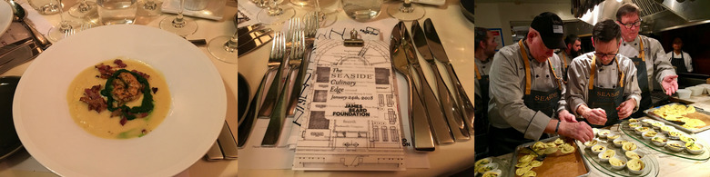 It was a lively scene last night at The Beard House, which brought chef Jim Shirley and team to NYC to share a "Taste of Seaside, Florida." Local media, James Beard Foundation members and Seaside locals—from notable architects pivotal to the Florida community's pioneering New Urbanist design to art gallery owners—were in attendance, mingling over Prosecco and passed plates like smoked ol' Florida mullet dip with housemade crackers, Sweet Home Farm Bayside Blue ravioli, fried Nine Mile Oyster Company oysters with mini biscuits and ham gravy, and fried green tomatoes with kimchi crackers.