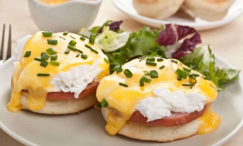Another great thing about eggs Benedict is the versatility. You can swap out the English muffin for a crab cake, or the ham for spinach or smoked salmon. And the hollandaise can easily be swapped out for just about any sauce, including Mornay, which is a Bechamel sauce with cheese melted into it. And if you replace the English muffin with artichoke bottoms and creamed spinach then you've got eggs Sardou, one of the classic Creole brunch dishes.