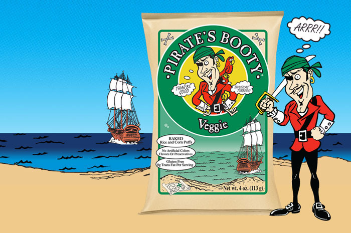 Pirate's Booty is a great snack, and Veggie Booty is even healthier. This baked snack is made with corn, rice flour, and a whole bunch of vegetables including spinach, broccoli, carrots, kale, and parsley.