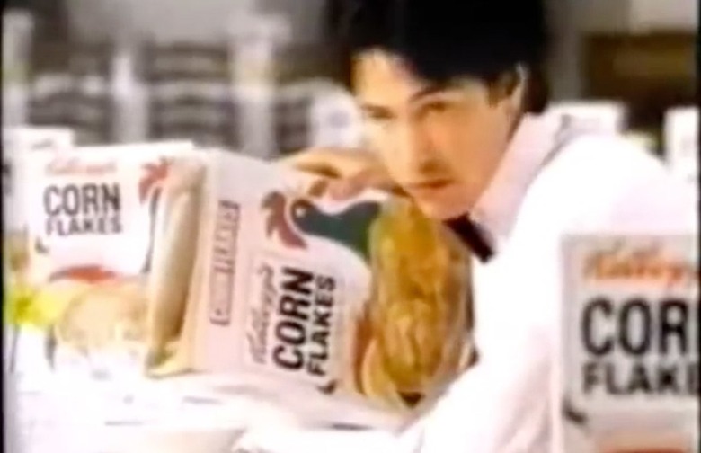 Keanu has a great time setting out boxes of Corn Flakes on three very long tables, and sneaking a bowl for himself, in this 1987 commercial.