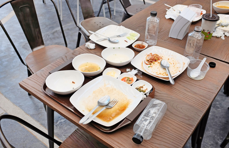 Sure, tables get a wipe-down between customers, but have you ever seen the ratty old rag that they usually use? All it basically does is spread the gunk around. If any of your food touches the table, consider it a goner unless it's covered with a fresh tablecloth.