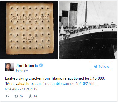 The Spillers & Bakers Pilot cracker was saved from a Titanic lifeboat by James Fenwick, a passenger on the Carpathia, the cruise liner that picked up Titanic survivors. Fenwick preserved the costly biscuit in an envelope and labeled it "Pilot biscuit from Titanic lifeboat April 1912."