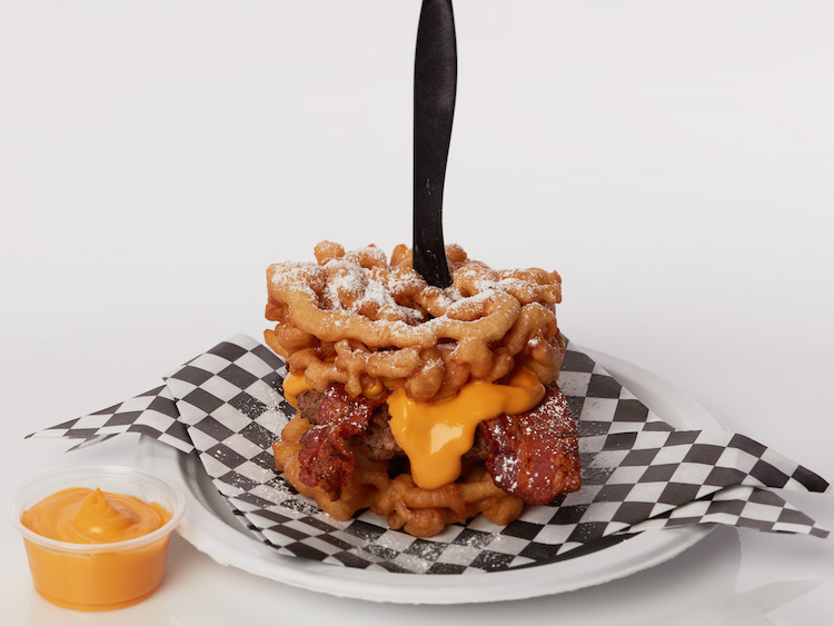 In addition to 28 years of experience as a concessionaire, Grace is also no stranger to the fairgrounds: 2017 marked his second year in the finals and his first year winning a title. His Funnel Cake Bacon Queso Burger begins with two funnel cakes for buns that are "fried to a golden crunch." The first funnel is topped with a burger patty, a large helping of bacon, and gooey queso. It is completed with the top funnel bun and dusted with powdered sugar.