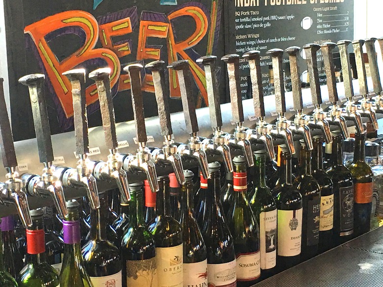Inside, railroad ties and repurposed wood are used for part of the paneling and design features. Take a second look at the taps; those pulls are actually made from old railroad spikes.