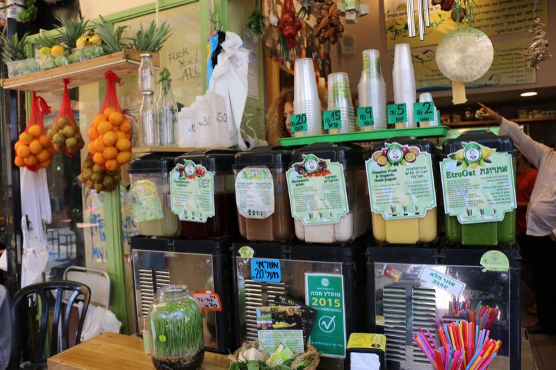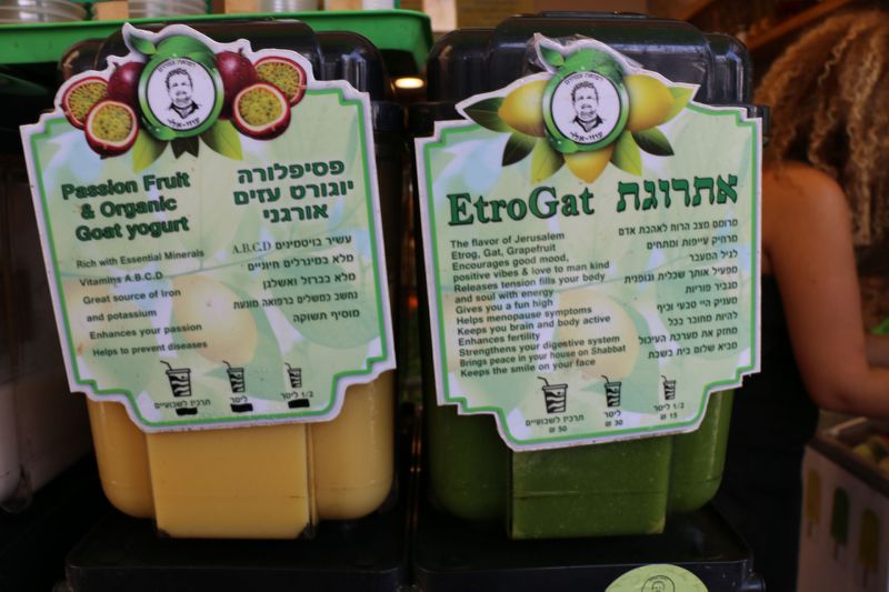 When I first walked into the funky little juice shop a beautiful woman, one of three of Uzi-Eli's children and the only girl, behind the counter offered my very first sip of etrog juice.