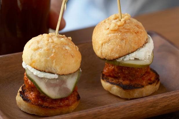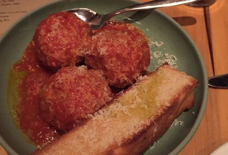 At Locanda Verde, chef Andrew Carmellini serves meatballs with a couple unique twists. He uses lamb (which he grinds with onions) instead of beef, pork, or veal, simmers them in tomato sauce, and serves them on small house-baked parmesan-onion buns topped with a dollop of goat cheese and a thinly-sliced pickle coin. They are unique, delicious, and still unmistakably Italian-inspired.