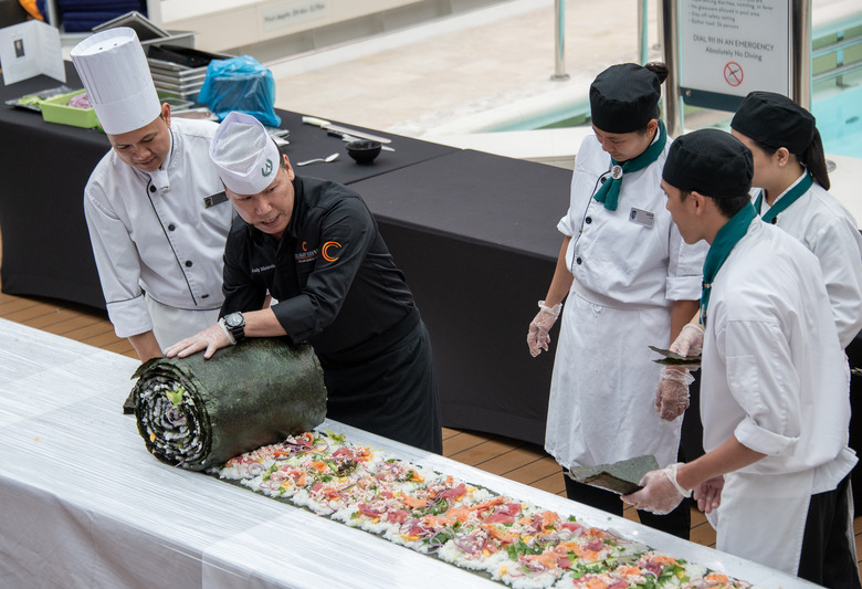 Matsuda and his kitchen staff showed off their raw talent by assembling the world-record sushi roll on the pool deck. Cruise guests witnessed the process, which involved 70 pounds of sushi rice and 150 sheets of Nori seaweed, plus more than 13 pounds of crab, salmon, shrimp, tuna, tobiko (flying fish roe), tamago (Japanese omelet), cucumber, red onion, and radish. The ship's Jacuzzi, we're sorry to report, was not filled with soy sauce for the occasion.