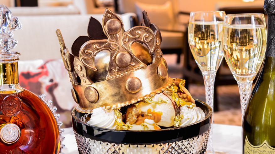 Served in a Wedgewood crystal bowl with Perignon champagne on the side, the ice cream even comes with a crown on top. The vanilla and chocolate cream bases are both made with Hennessy VSOP cognac.