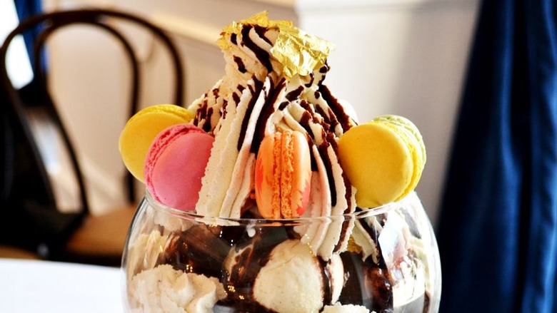 Made with vanilla ice cream, this sundae is topped with whipped cream, chocolate truffles, French macaroons, and gold leaves.