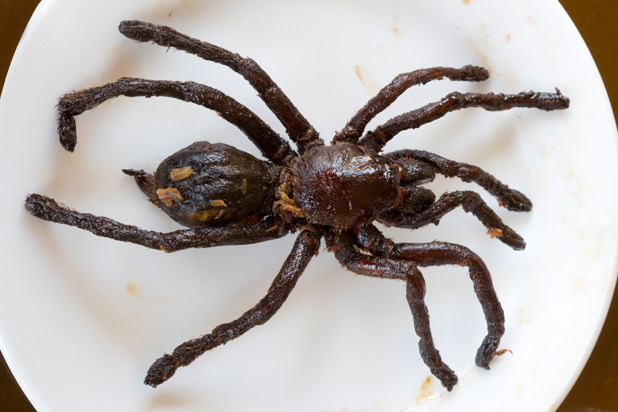 A palm-sized species of black tarantula known as "a-ping" is a well-known culinary specialty of Skuon, a small Cambodian village north of Phnom Penh. The rural area is sometimes called "spiderville" for the street vendors selling heaping trays of whole arachnids, which are bred in underground lairs and fried with garlic, sugar, spices, and salt until their legs are crispy and their bodies turn a dusky red.