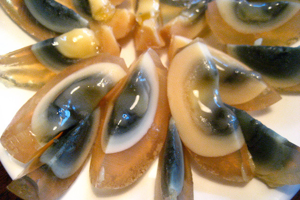 The Chinese cover raw eggs (duck, chicken, and sometimes quail) with a mix of clay, ash, quicklime, salt, and straw and let them sit for weeks or months to cure. The yolks turn deep-green and soften; the whites disintegrate into a transparent amber jelly. Reeking of sulphur, they're served with silken tofu or pork, scallions and ginger, in the rice porridge known as congee, or simply as part of a banquet platter of cold finger foods.