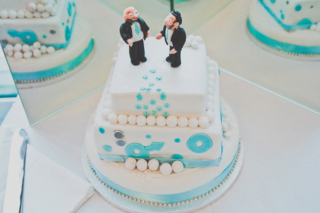 This couple celebrated cut into a cake bearing miniature versions of the grooms as fondant cake toppers.