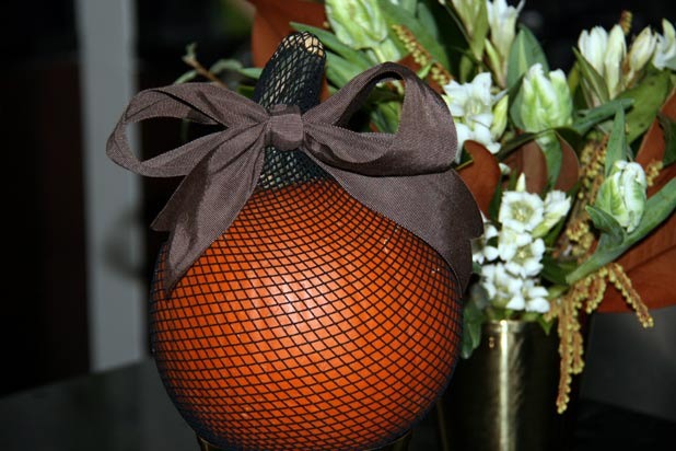 Short on time? Pick up a couple of packages of crazy-patterned tights, or old fishnets, and dress up that orange orb in less than a minute.