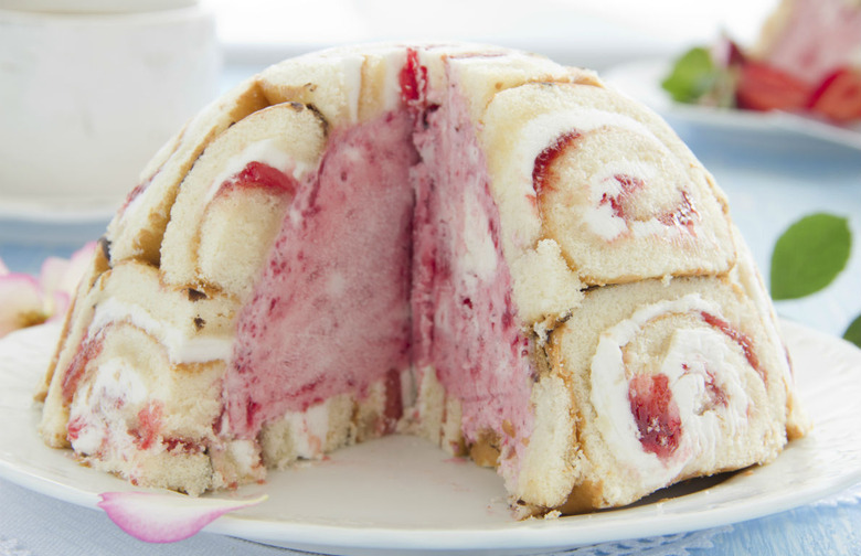 Make a Swiss roll, slice it thinly, and use it to form the outer shell of this delicate cake. Filled with a set raspberry bavarois, this has the potential to be the lightest, sweetest dessert. It also has the potential to be a squashed mess, if the custard doesn't set quite perfectly, and the Swiss roll exterior collapses, which is why you should probably just skip trying this one at home.