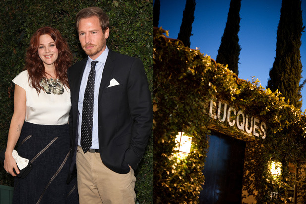 Drew Barrymore and Will Kopelman tied the knot in the summer of 2012 in a celebration planned by Yifat Oren, who oversaw the food-centric celebration. Chefs Jon Shook and Vinny Dotolo from Los Angeles haunts Animal and Son of a Gun catered the lobster roll and pork bun appetizers. Naomi Pomeroy, of Top Chef Masters fame, presented guests with foie gras served on pink peppercorn shortbread, and a steak tartare with quail eggs. Ice cubes with pansy flowers decorated drinks, to play with the night's floral theme. Guests were also offered Barrymore's own recently launched Barrymore Wines. The main meal was catered by Lucques restaurant, which presented a country-style family dinner of fried chicken and steak.