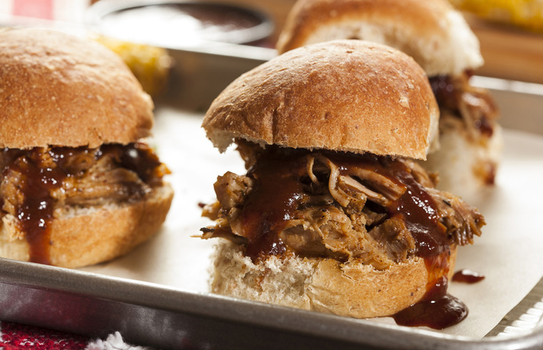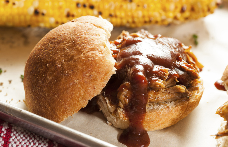 Stringy pieces of pork shoulder melt in your mouth as you bite into this sweet barbecue sandwich. This recipe is topped with crisp coleslaw, but you could switch it out for a rich mac and cheese to make your sandwich even more awesome.