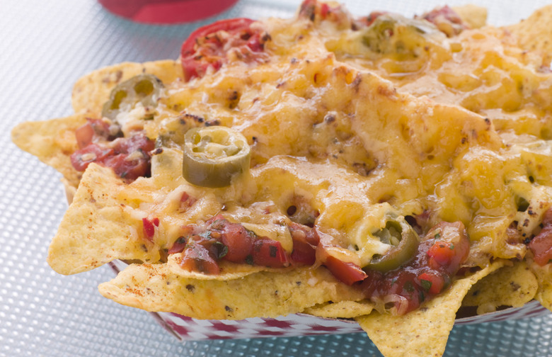 These nachos are a fantastic thing to snack on when you can't take your eyes off of the television. Filled with chicken, Colby and Monterey Jack cheese, chunky salsa, pinto beans, and more, you won't find a tortilla chip that isn't full of flavor.