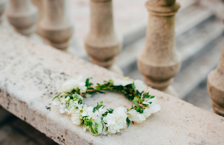 In Greek orthodox ceremonies, the bride and groom are declared married when the priest blesses two crowns three times and places them on the heads of the bride and groom. Though styles vary with the wedding's colors and theme, traditional crowns were made of delicate white flowers and evergreen leaves as a symbol of fertility and purity.