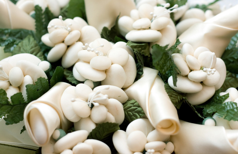 At Italian weddings, confetti is not little scraps of paper thrown at the bride and groom after the ceremony. It's candy-coated almonds! White almonds represent the wedding day, pink and blue almonds represent the couple's future children, and silver and gold almonds represent future anniversaries and a long life together. These candies used to be thrown at the bride and groom but are now given out as favors to guests.