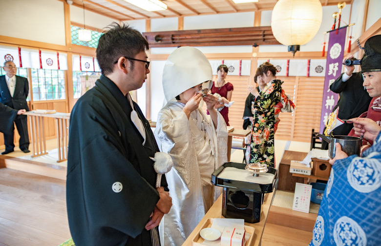 Of course sake is a part of a traditional Japanese wedding. The phrase san san kudo means "three, three, nine times" — during this ceremony the bride groom and bride drink sake three times from three different cups. In exchanging cups, they are also exchanging their marriage vows. The couple's parents also drink from the sake cups, symbolizing the union of two families.