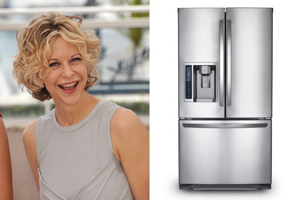 Meg Ryan's spacious Martha's Vineyard kitchen was designed by Marsha Russell of Satinwood in New York. The breezy space features an oak kitchen table, storage cabinets with large glass doors, and industrial pendant lights by Historical Materialism. Her stainless steel refrigerator complements her Viking range, as well as the dark cabinets under industrial countertops. Her pantry stands out with massive Bluestone shelves and white painted brick.