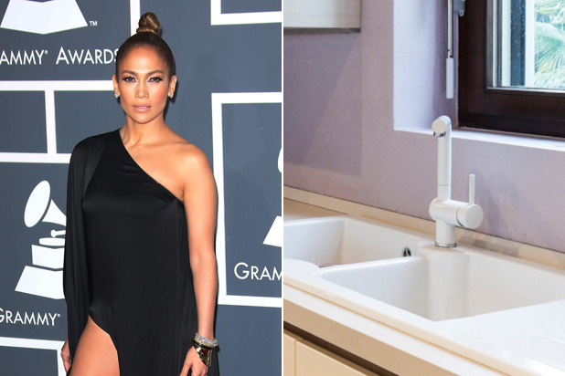 Jennifer Lopez's California kitchen features some surprising design details, like gray-blue cabinetry and a beautiful black and gold stove. Her interior designer, Michelle Workman, explained, "There are all these tones of gray, and we played with that — using a bit more of a gray-taupe here, a bit more of a gray-blue there. It's almost like a black-and-white film from the forties." The white high-gloss countertops work to complement her white porcelain sink and white window sills.