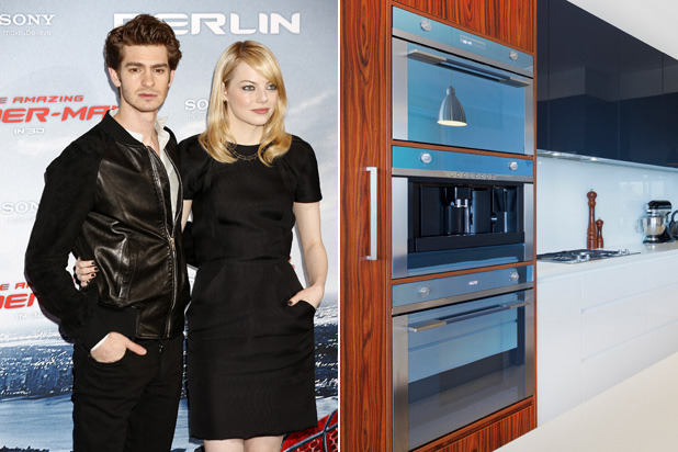 In the Beverly Hills, Calif., home that they share, Emma Stone and Andrew Garfield prepare meals in their massive white galley-style kitchen that features an opening into the dining room, and windows onto their lush gardens. Design features include wood-beamed ceilings and dark wood floors. Their appliances are stainless steel, nestled under white tiled countertops.