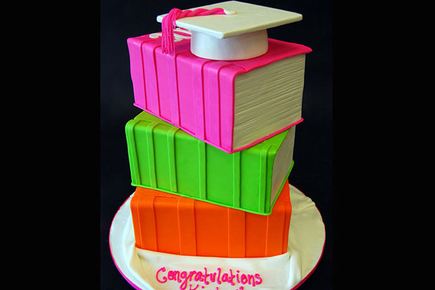 This cake from New Jersey-based Pink Cake Box takes a simple design and makes it amazing. Three towering books covered in neon-colored fondant are stacked atop each other and topped with a white mortarboard. We wonder how big that graduation party was.