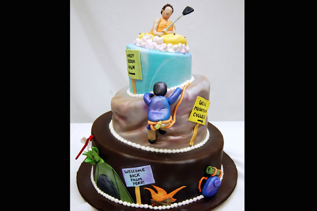 Inspired by the adventures one graduate has been on (and has yet to embark on), this cake (with a different flavor and filling in each layer) from Pink Cake Box features a mountain climber and a whitewater rafter along the sides. What you don't see here is that it was accompanied by 36 additional cupcakes in a variety of flavors and fillings, too.