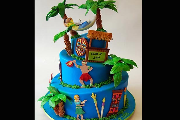 For the graduate who has worked their hardest on papers, theses, and exams, a trip to the beach after graduation seems like the ideal escape — yet is more likely a dream. (Do you hear the real world calling?) In honor of one day-dreaming grad, Pink Cake Box brought the beach to the graduation party with this three-tier, topsy-turvy cake featuring the graduate resting on a hammock on the top tier, surrounded with palm trees, a portable DVD player, and a tiki cocktail hut. Too bad it doesn't serve drinks, too...