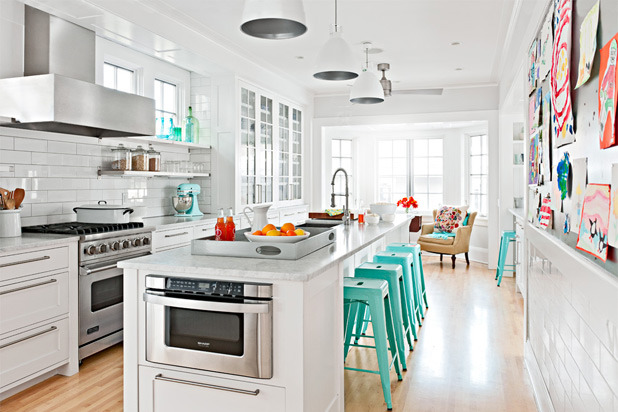"Great use of a long/narrow space. The turquoise stools and kids art on the wall make this for me." —Julie Massucco, Massucco Warner Miller Interior Design and Decoration