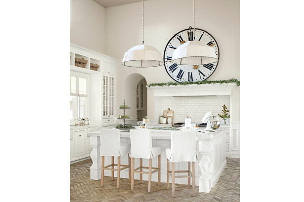 "Herringbone flooring makes me swoon! The over-scale enamel clock and stylish slipcovered stools make me want to sit and watch the cook. The white Bobo Intriguing Objects pendants are just perfect." —Jill Sharp Brinson, Jill Sharp Style