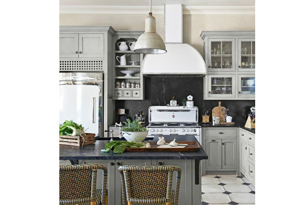 "The cabinets in this kitchen, designed by Parrish Chilcoat and Joe Lucas, with builder Matt Morris, are painted a warm gray; the island is done in a slightly cooler shade. The acid-washed limestone tiles and the custom stainless-steel hood and other appliances bring in more grays. That tone-on-tone idea creates depth and richness." —House Beautiful