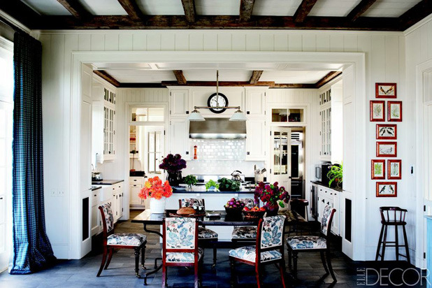 "In a Millbrook, NY home renovated by architect Gil Schafer and designed by Miles Redd, the cabinets are custom made, the vent hood is by Wolf, and the 19th-century chairs are upholstered in a Bennison fabric." See more. —ELLE Decor