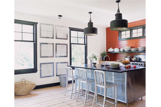 "Sometimes, all you need is one wall painted a vivid color. In this kitchen that spicy red warms up the space—the painted equivalent of a glowing fire on the hearth. Designer Amanda Kyser accentuated the strong horizontal lines of the headboard—which make the room feel wider—by adding a long shelf that spans the back wall. Vintage French factory lights provide bright task lighting and add another strong black accent." —House Beautiful