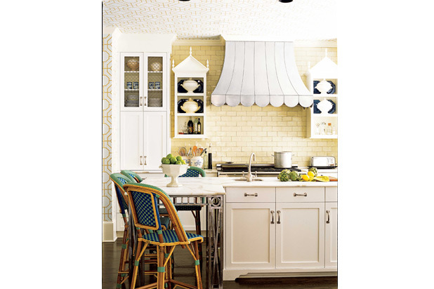 "This is a great display of color and detail; the wallpaper on the ceiling, citron subway tile, and an interesting island leg design." —Benjamin Dhong, Benjamin Dhong Interiors