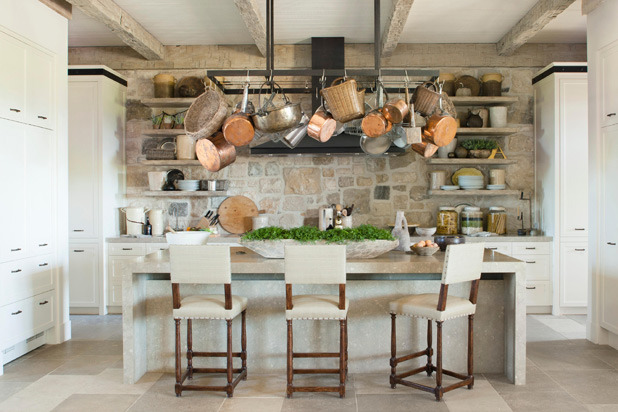 "This kitchen combines an efficient use of space and excellent use of materials. The stone wall provides an effective focal point — both warm and practical. Love the iron pot rack!" —Robin Bell, Robin Bell Design, Inc.