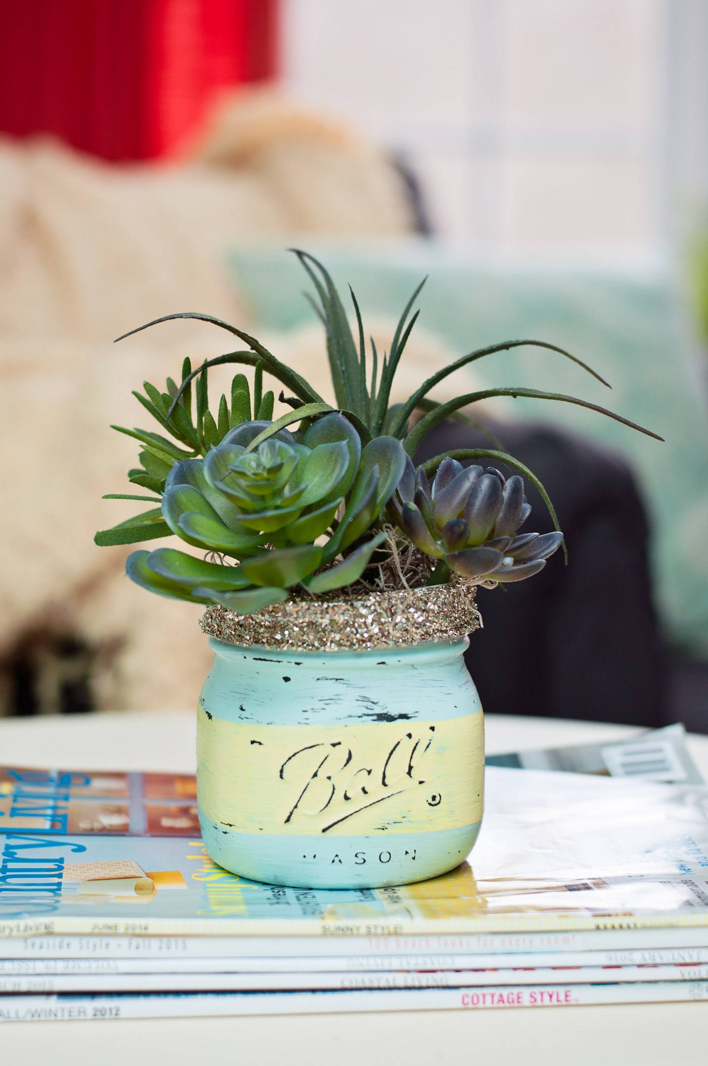 These DIY Mason Jar Succulents are absolutely beautiful and only involve four steps. Use Ball® Collection Elite® Wide Mouth Pint Jars and paint them any color you like, but we especially love the spring-y feel of the blue and yellow here. You can place these in the kitchen or living room to really revitalize the space.