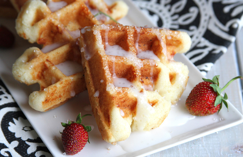 Did you know you can make breakfast staples for dessert? These coconut lemon dessert waffles are made with the Krusteaz Meyer lemon pound cake mix, coconut water, and coconut milk. Served in slices and topped with a decadent lemon glaze, these waffles will make it so you'll never look at your waffle iron the same!
