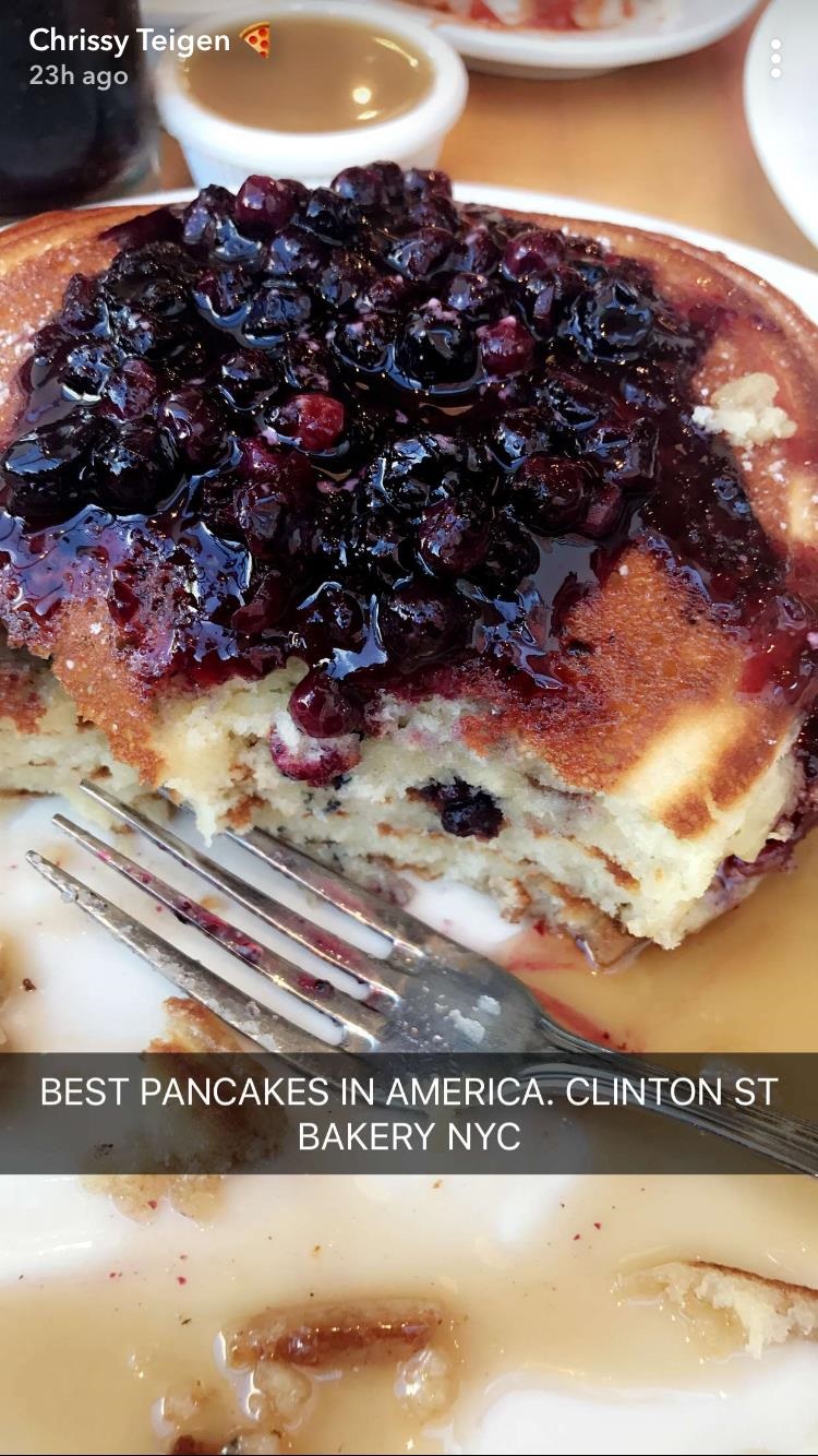 We peeped at the menu of this Lower East Side hotspot, and it seems as though Clinton Street's pancakes are served with warm maple butter and the customer's choice of wild Maine blueberries, bananas and walnuts, or chocolate chunks. It appears that Teigen opted for the blueberry stack.