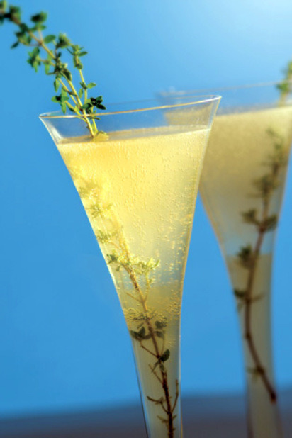 Organic elderflower liqueur has a toasty, almost nutty flavor. It's the perfect pairing with dry champagne and a dash of lime. The pretty leaves of the thyme sprig garnish are so tiny and delicate, they add some decorative loveliness to this bracing celebratory cocktail.