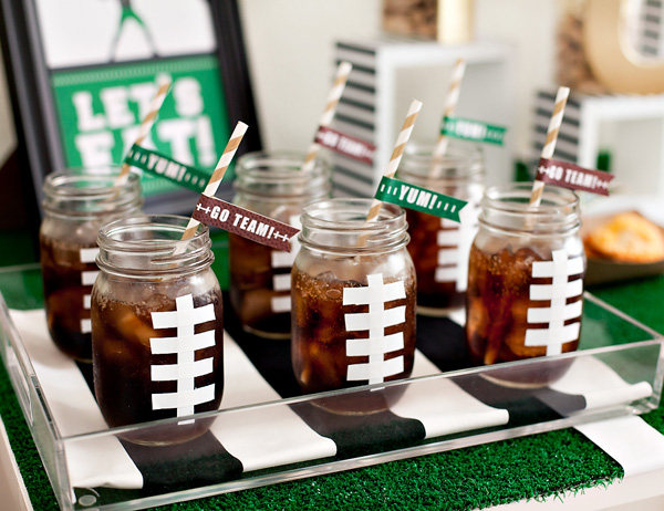 You can also set your party apart by going the extra yard with easy, football-themed entertaining décor. For cocktails or sodas, serve beverages in mason jars, marked like a football with duct tape and add a chevron straw with a yard line inspired banner for guests to easily label their drinks!