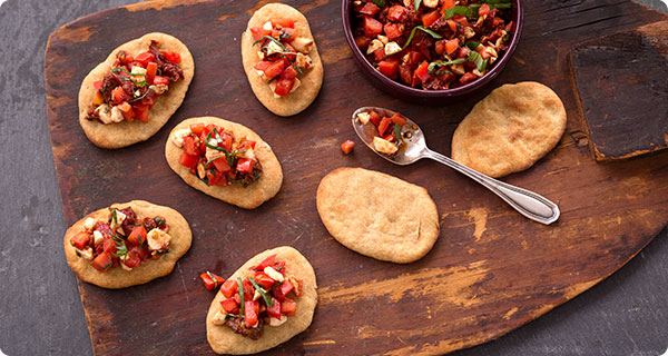Bruschetta Bites are a quick and easy appetizer that can be made in large batches. Mix together your tomato topping and add a dollop on the top of whole wheat flatbread for an easy, healthy snack.
