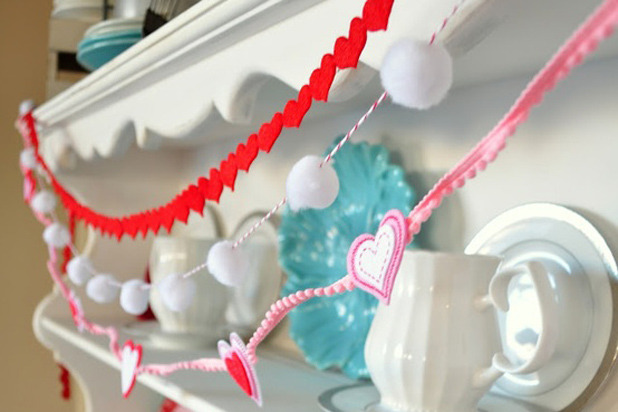 This is the perfect heart-infused décor to hang across the mantel, over a doorway, or just to add a punch of color to a wall — make your heart garland out of felt and sew it together, or punch holes and thread a string through the pieces. Mix and match festive colors for a fun decoration that's simple and chic.