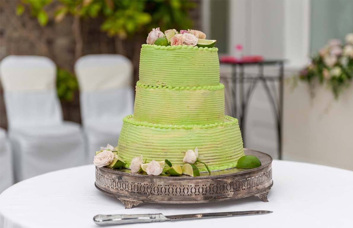 Green may not be the most appetizing color for desserts in the world, so using greenery as your accent color on your cake through the use of ribbons, alternating layers of green and white, or ombre effects may be the best way to go.