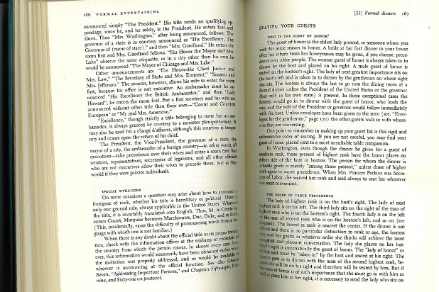 Gone is the time when the host chose where people sat — instead, it was all about social standing. "The woman guest of honor is always taken in to dinner by the host and placed on his right. A male guest of honor is seated on the hostess's right. The lady of next greatest importance sits on the host's left and is taken in to dinner by the gentleman on whose right she sits." Page 167.