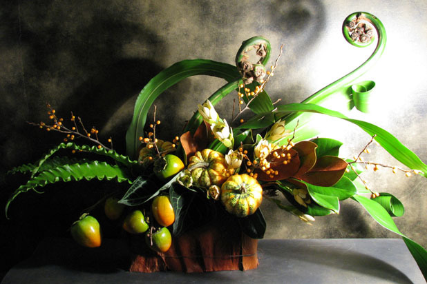 This arrangement from Florisity takes a modern interpretation of a harvest theme. It utilizes classic harvest materials, like persimmons, pumpkins, large fiddlehead ferns, ilex berries, and magnolia leaves.